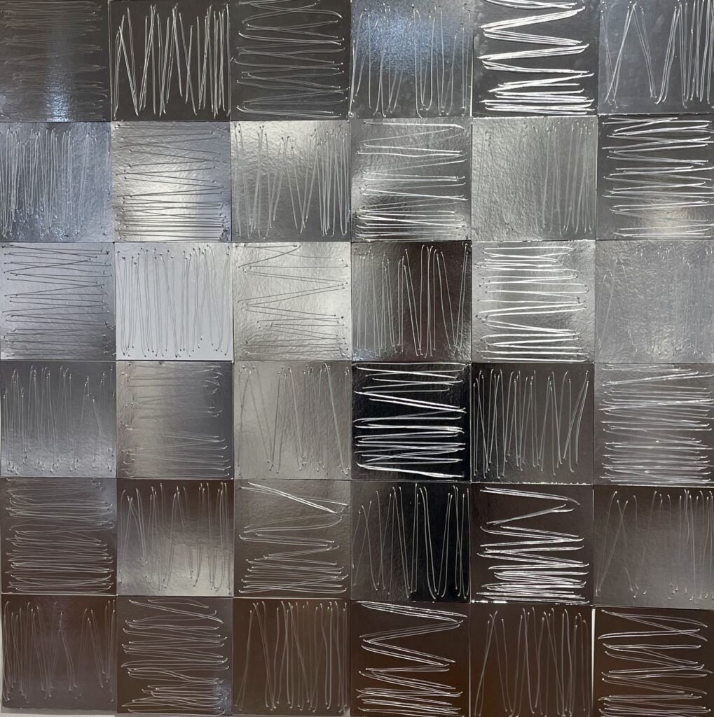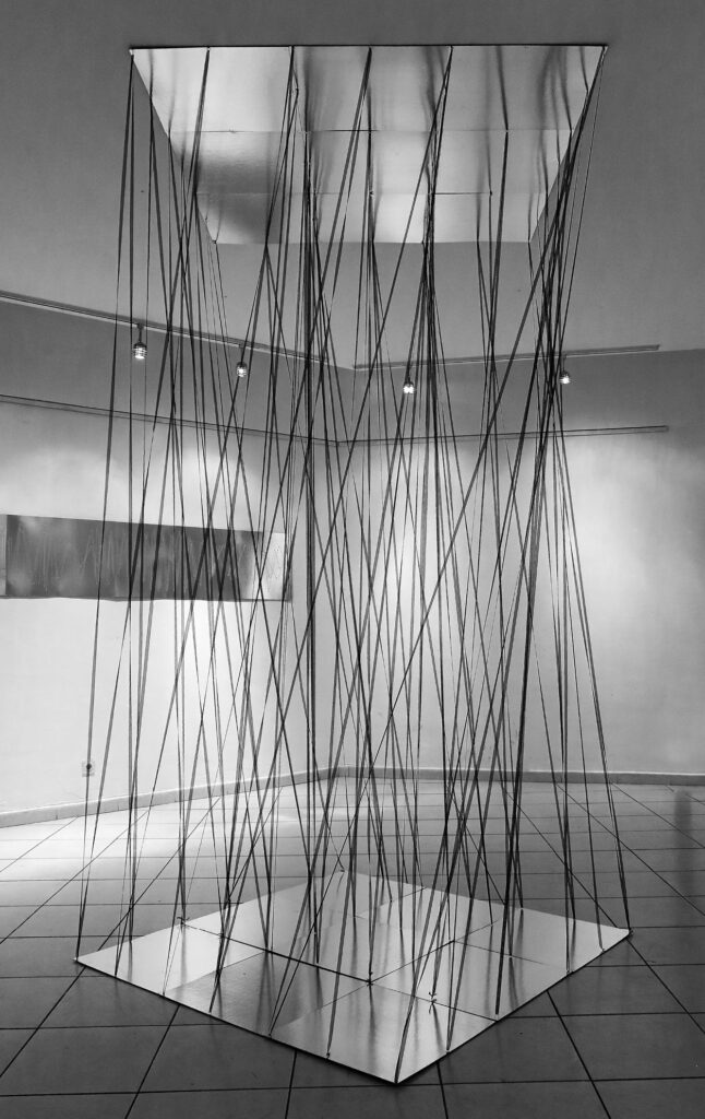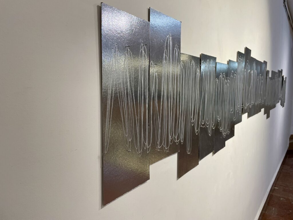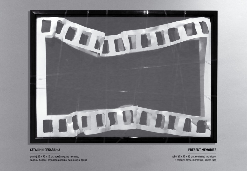 – Ги изложив речиси сите дела, со исклучок на неколку. Станува збор за група од седум инсталации изработени од каширан огледален картон, силиконски конци и црн муслин, добивајќи се ефект дека е шиено на огледало. Елементите се работени во делови за да може да се препакуваат, да се транспортираат и повторно да се аранжираат на самото место. Дополнително, поставив и светло за да се добие рефлексија на светлината во огледало, дури некаде употребив и ласер и многу добро изгледаше.