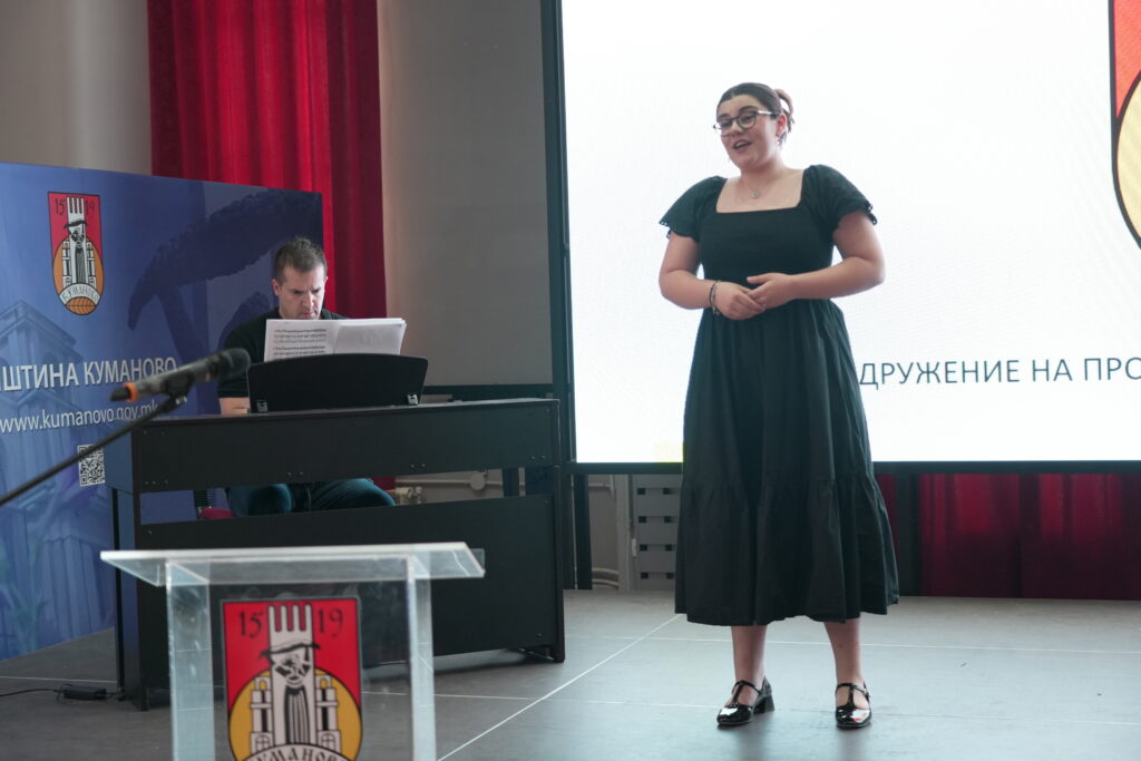 По обраќањето на Ивана Ѓорѓиевска, повторно следуваше настапот на ученици од „Панче Пешев“, вокална изведба на Ева Симоновиќ, соло пеење, во класата на проф. м-р Ивана Андоновска – композиција „An die muzik“ од Шуберт, во пијано придружба на проф м-р Марко Митковски, од Училиштето за основно музичко образовние „Панче Пешев“.