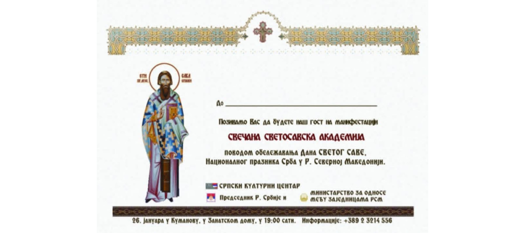 По повод Св. Сава, национален празник на Србите во Македонија, традиционално Демократската партија на Србите од Македонија и Српската заедница р.о. Куманово организираат Свечена светосавска академија. Академијата ќе се одржи на 26 јануари 2026 година, со почеток во 19:00 часот, во Занаетчискиот дом во Куманово. За овогодишната академија, како и досега, организиран е квалитетен програм со цел достоинствено да се одбележи националниот празник на Србите.